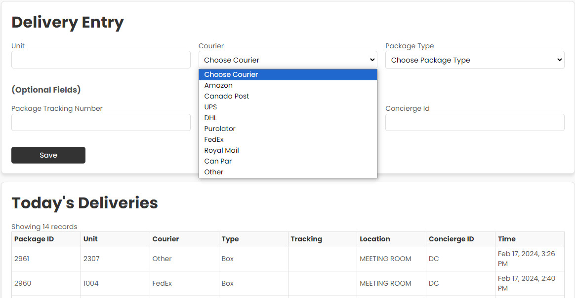 Simple concierge entry for deliveries with package barcode scanning function with prefilled package types and location and concierge ID entries